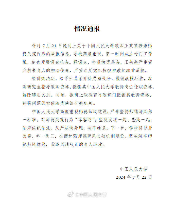 举报情况属实!7月22日傍晚,中国人民大学再次发布情况通报:针对7月21日晚网上关于中国人民大学教师王某某涉嫌师德失范行为的举报信息,经调查,举报情况属实,“给予开除党籍处分,撤销教授职称,取消研究生指导教师资格,撤销其中国人民大学教师岗位任职资格,解除聘用关系”。
