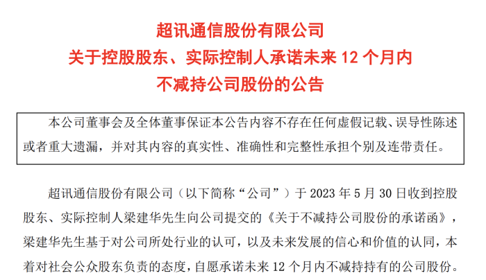 界面新闻注意到,超讯通信2023年5月曾发布公告称,梁建华向公司提交《关于不减持公司股份的承诺函》,梁建华基于对公司所处行业的认可,以及未来发展的信心和价值的认同,本着对社会公众股东负责的态度,自愿承诺未来12 个月内(2023年5月31日至2024年5月30日)不减持持有的公司股份。