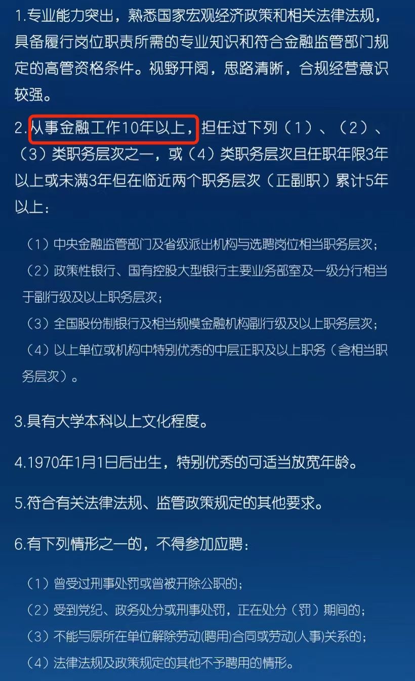 从岗位资格来看,渤海银行较其他两家更为严格。譬如,渤海银行要求应聘者从事金融工作10年以上,担任过金融监管部门、政策性银行、国有大行、股份行等相关职务。并且,要求应聘者1970年1月1日后出生,特别优秀者可适当放宽年龄。