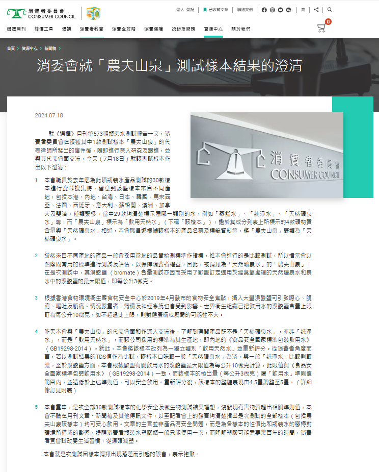 财联社7月18日讯,香港消委会官网发布澄清声明称,昨天本会与农夫山泉的代表会面和作深入交流后,了解到有关产品既不是天然矿泉水」,亦非「纯净水」,而是「饮用天然水」,而该公司采用的标准为其生产地,即内地的《食品安全国家标准包装饮用水》(GB19298-2014)。