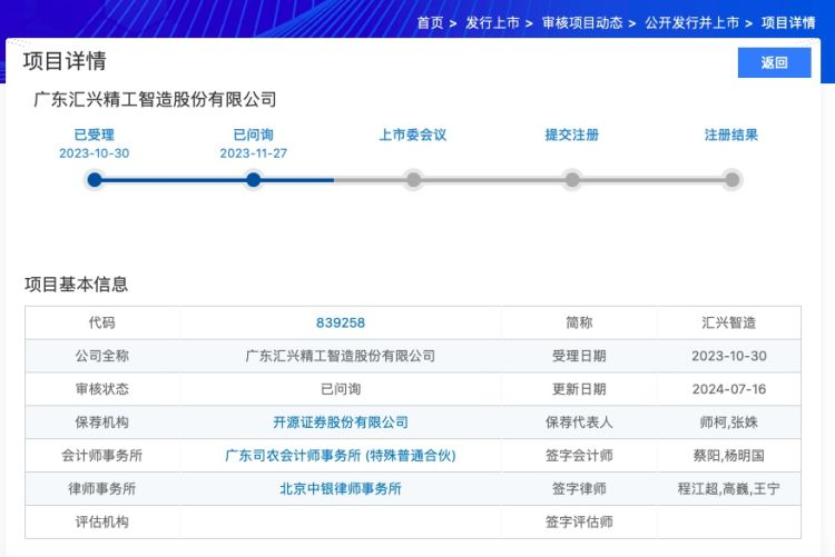 7月16日,据北京证券交易所网站显示,新三板创新层公司广东汇兴精工智造股份有限公司(以下简称“汇兴智造”或“公司”)已经回复了第二轮审核问询函,并更新了首轮问询的回复。汇兴智造的IPO申请于2023年10月30日被北交所受理,保荐机构为开源证券。