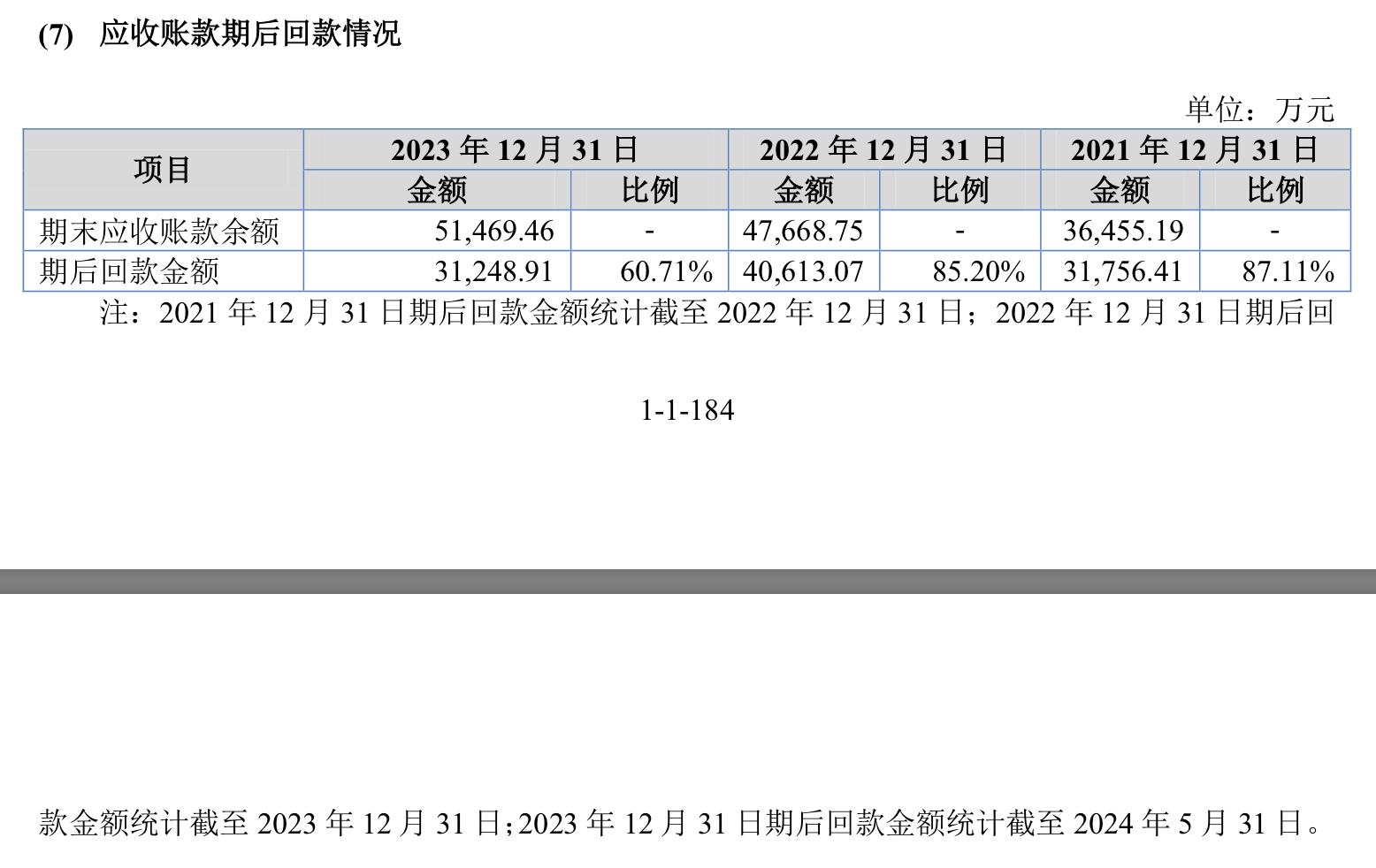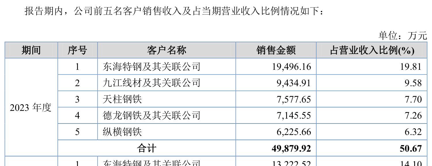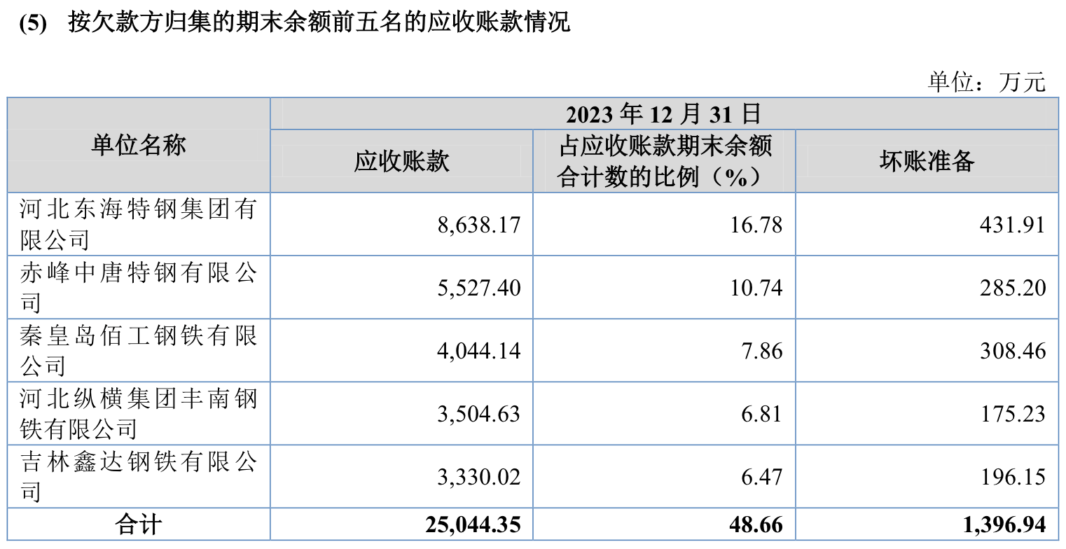 来源:公告根据说明书,国亮新材2023年应收账款余额前五名客户合计为25044.35万元,占应收账款期末余额比例为48.66%,主要为销售货款。国亮新材称,由于主要客户为国内中大型钢铁企业,有陆续回款,应收账款账龄主要集中在一年以内,发生坏账损失的风险较小。