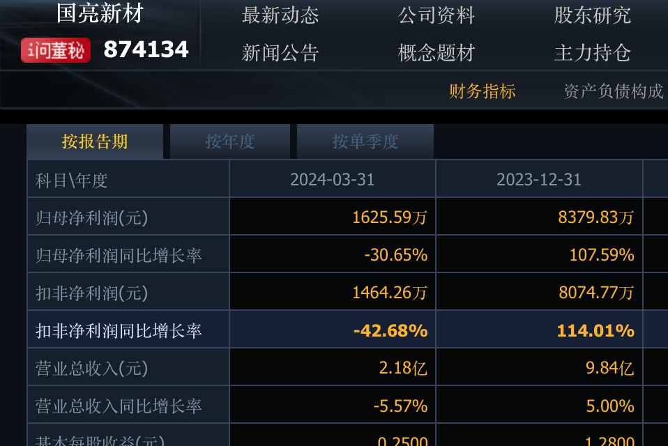 国亮新材(874134.NQ)是北交所最近一批受理公司中,唯一来自河北唐山的。该公司专注高温工业用耐火材料,下游系钢铁行业。不过最近的财务数据显示,2024年一季度公司营业收入净利润出现同比双降。
