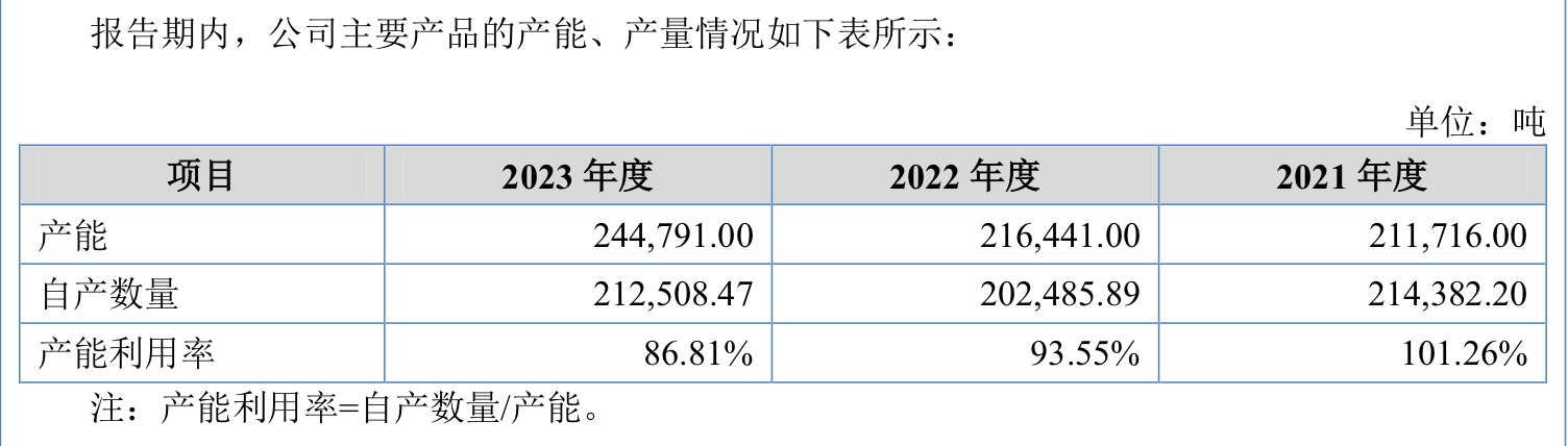 不过需要指出的是,国亮新材的产能利用率在下降,2021年至2023年的产能分别为21.17万吨、21.64万吨、24.48万吨,自产数量为21.44万吨、20.25万吨、21.25万吨,利用率分别为101.26%、93.55%、86.81%。国亮新材称,主要系受公司镁碳砖车间改造升级使得产能提高以及客户需求变化的的影响。那么,募投扩产后续如何充分消化,将是摆在公司面前的难题。