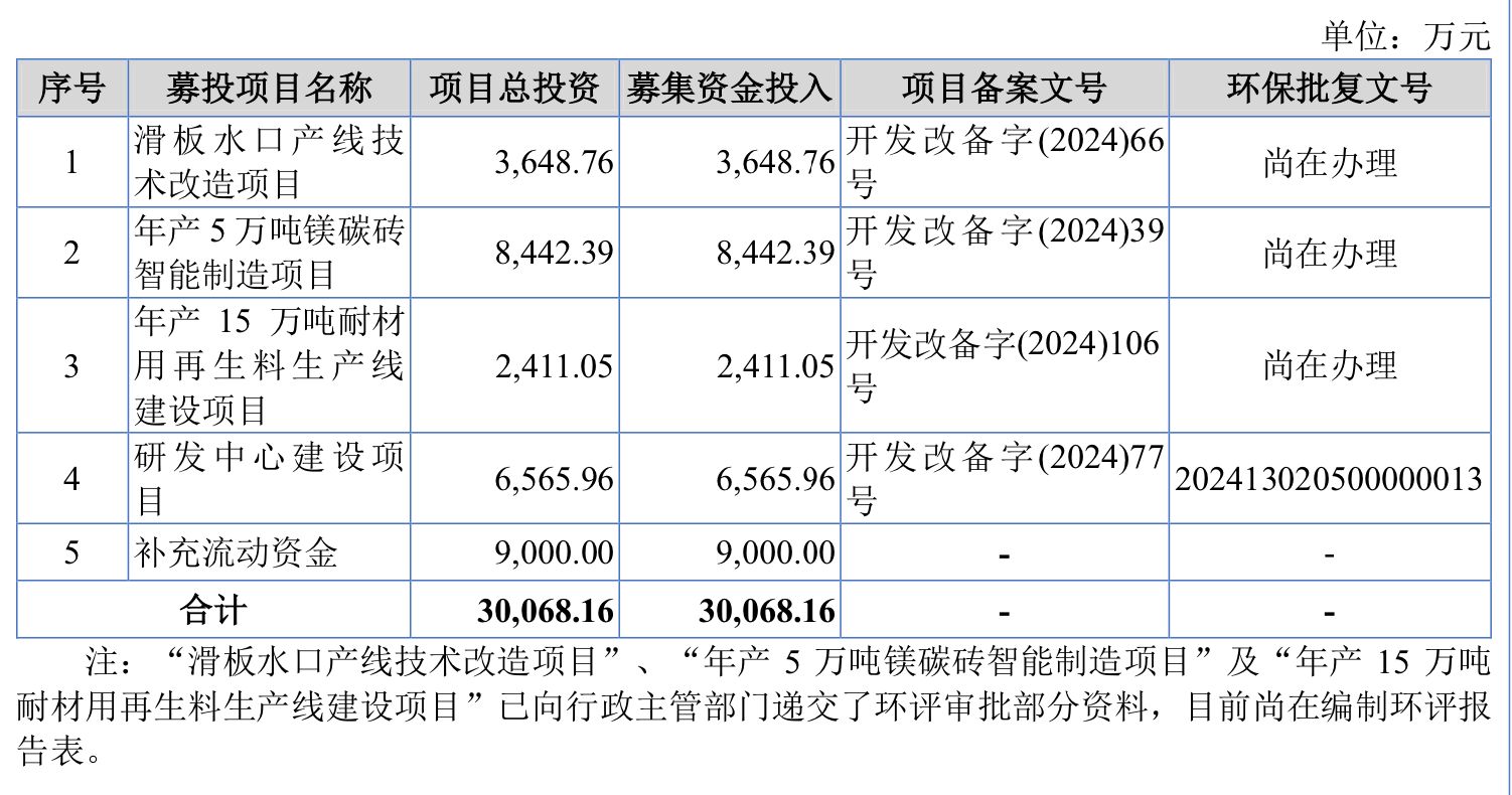来源:公告有关募投,值得一提的是,“滑板水口产线技术改造项目”、 “年产5万吨镁碳砖智能制造项目”和“年产15万吨耐材用再生料生产线建设项目”所涉的环评手续尚在办理中。如果环评手续未能如期取得,将会影响募投的正常实施进度。