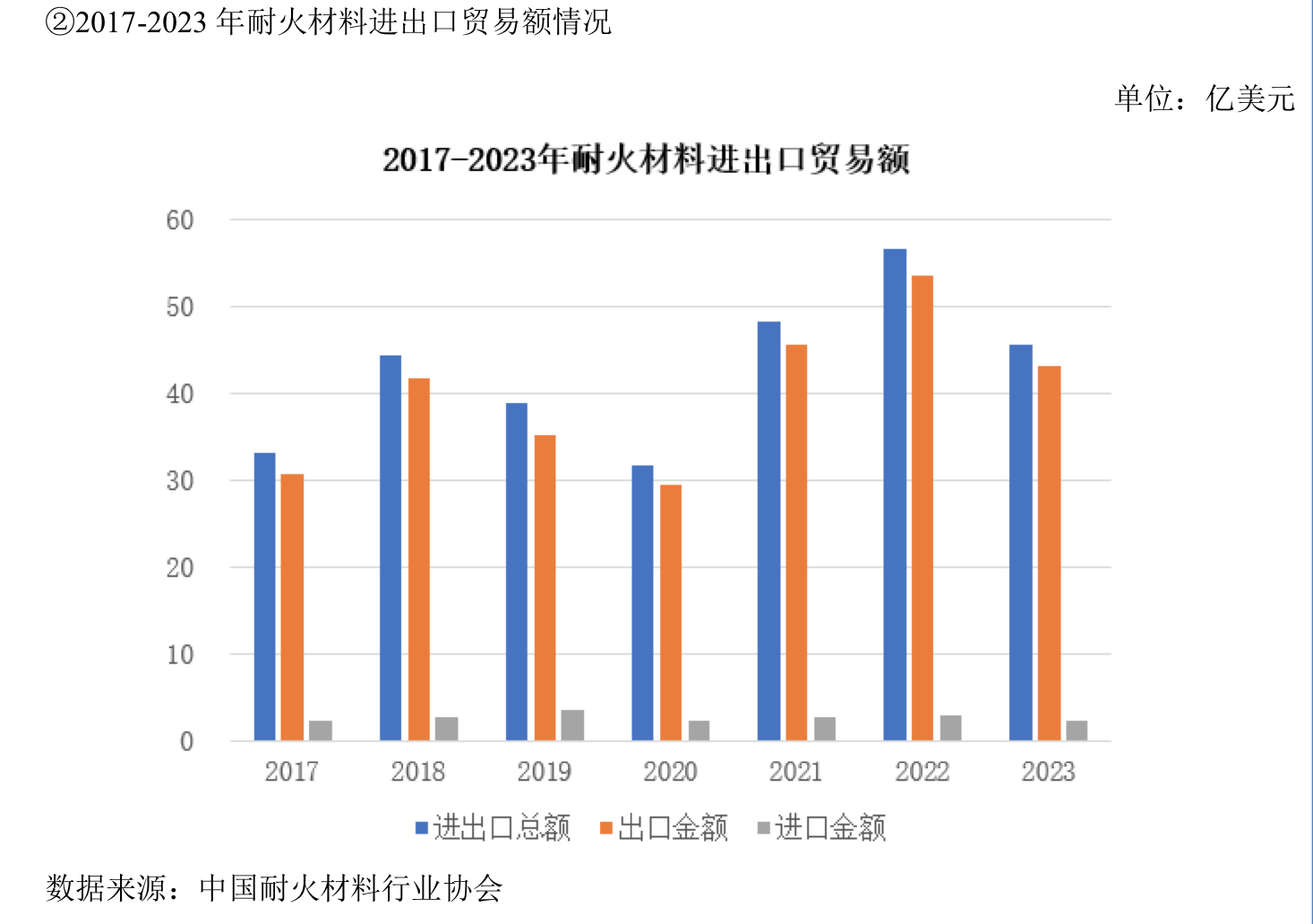 2023年全国耐火材料产量为2298万吨。2023年我国耐火材料进出口贸易总额达45.63亿美元,其中出口贸易额高达43.16亿美元。