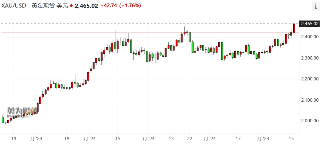 现货黄金最新站上2460美元/盎司关口,日内涨幅扩大至1.77%,打破了5月底创下的高点,主要源于美国通胀放缓的迹象点燃了美联储将很快开始降息的期望。