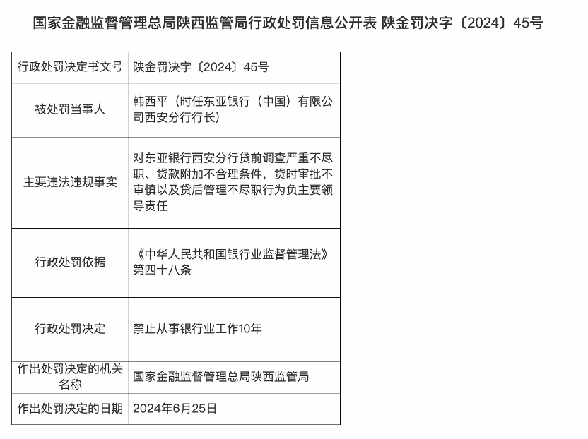 此前,国家金融监督管理总局陕西监管局公布的行政处罚显示,东亚银行(中国)有限公司西安分行行长(时任)韩西平因在任期间对东亚银行西安分行贷前调查严重不尽职、贷款附加不合理条件,贷时审批不审慎以及贷后管理不尽职行为,被禁止从事银行业工作10年。作出处罚的决定日期为2024年6月25日。
