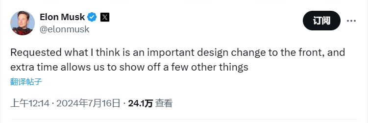 在网友一再追问之下,马斯克当天在社交媒体平台上回应称:“我要求对Robotaxi前部进行重要设计更改,因推迟发布日期而得来的额外时间将让公司有机会展示一些其他的内容。”