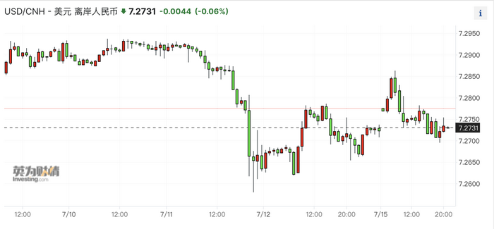 人民币也开始企稳回升,截至同一时段,美元/人民币收盘报7.2627,美元/离岸人民币报7.275,早前离岸人民币汇率一度突破7.3。