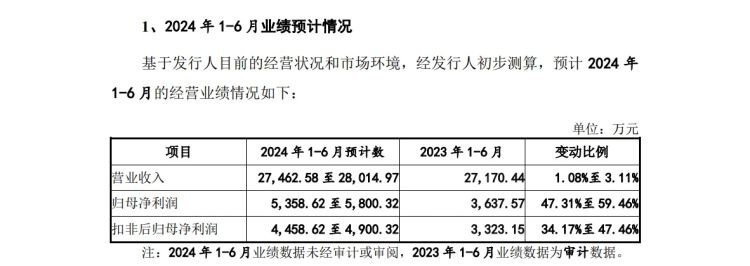 沃文特还在招股书中披露了2024年1-6月业绩预计情况。公司预计2024年1-6月营业收入为27,462.58万元至28,014.97万元,同比增长1.08%至3.11%;预计归母净利润为5,358.62万元至5,800.32万元,同比增长47.31%至59.46%;预计扣非后归母净利润为4,458.62万元至4,900.32万元,同比增长34.17%至47.46%,利润的增长主要是自有产品业务规模的增长。