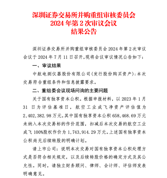 7月11日,深交所并购重组委审议通过中航电测仪器股份有限公司(300114)发行股份购买航空工业成飞100%股权的重组项目。