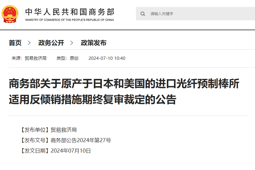 2023年7月10日,应中国光纤预制棒产业申请,商务部发布2023年第24号公告,决定自2023年7月11日起,对原产于日本和美国的进口光纤预制棒所适用的反倾销措施进行期终复审调查。