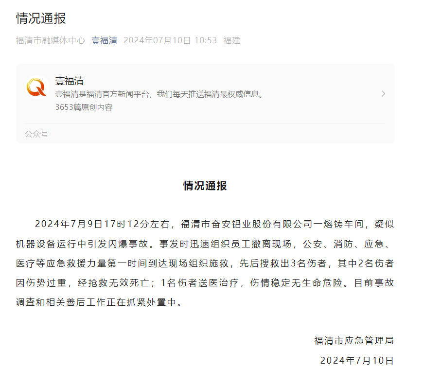 7月9日17时12分左右,福清市奋安铝业股份有限公司一熔铸车间,疑似机器设备运行中引发闪爆事故。事发时迅速组织员工撤离现场,公安、消防、应急、医疗等应急救援力量第一时间到达现场组织施救,先后搜救出3名伤者,其中2名伤者因伤势过重,经抢救无效死亡;1名伤者送医治疗,伤情稳定无生命危险。目前事故调查和相关善后工作正在抓紧处置中。