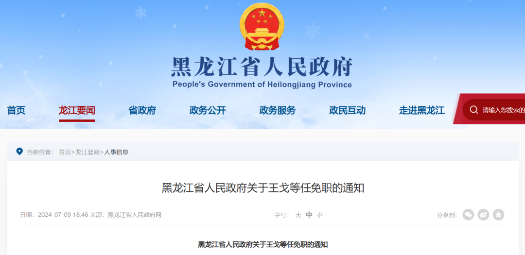 7月9日,黑龙江省人民政府发布关于王戈等任免职的通知。黑龙江省政府决定:王戈为黑龙江龙煤矿业控股集团有限责任公司总经理人选,决定时间6月7日;郭跃华任省工业和信息化厅副厅长,任职时间6月14日;韩福友任省水利厅副厅长,试用期一年,任职时间6月7日;刘玉泉任省应急管理厅副厅长、省煤炭生产安全管理局局长,试用期一年,任职时间6月7日;刘鹏飞不再担任黑龙江龙煤矿业控股集团有限责任公司总经理职务,决定时间6月7日;免去曹虎的省工业和信息化厅副厅长职务,免职时间6月7日;免去卢连宁的省应急管理厅副厅长、省煤炭生产安全管理局局长职务,免职时间6月7日。
