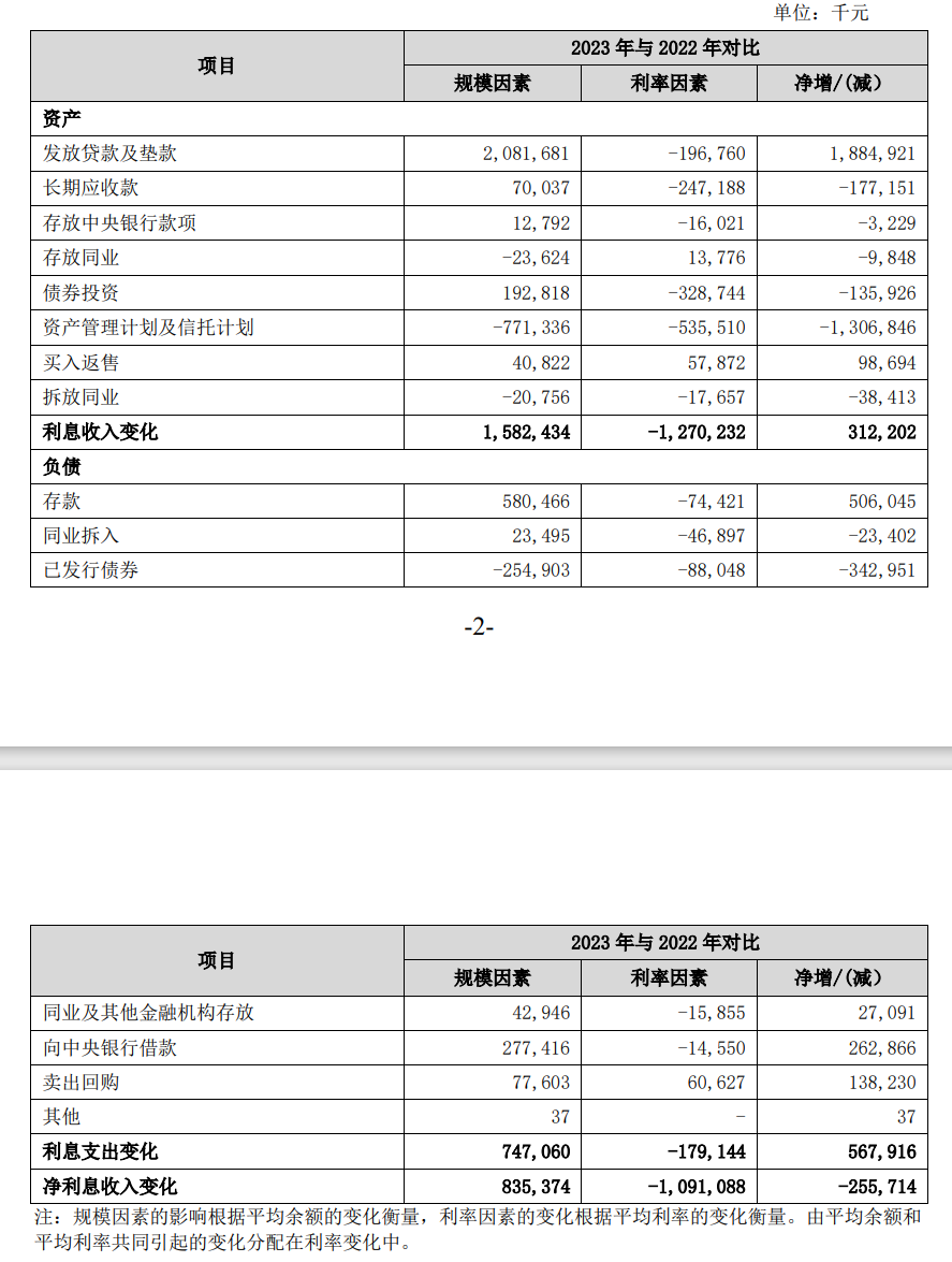 针对经营业绩方面,该行回复称,2023年实现利息净收入135.76亿元,较上年减少2.56亿元,下降1.85%。其中,各项资产负债平均余额变动带动利息净收入增加8.35亿元,平均收益率和平均成本率变动导致利息净收入减少10.91亿元。