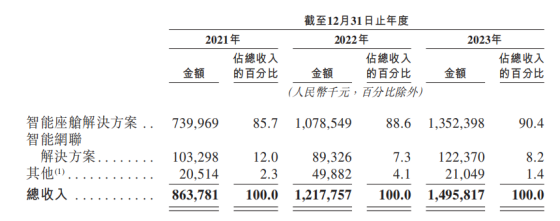 截至目前,博泰车联网的收入主要来源于智能座舱解决方案及智能网联解决方案。其中,智能座舱解决方案在收入中的贡献占比较高,从2021年的85.7%提升至2023年的90.4%;同期,智能网联解决方案的收入贡献则由12%下滑至8.2%。