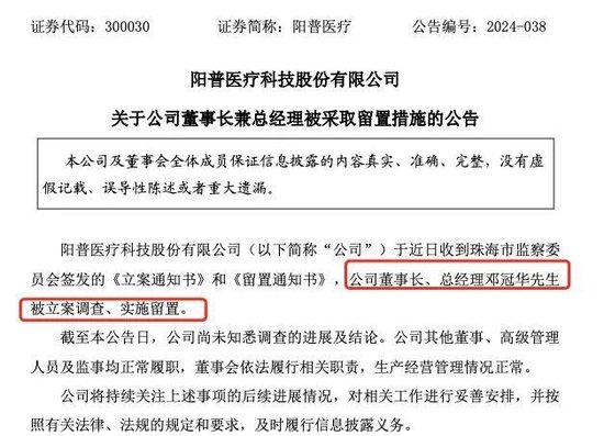 此前,4月8日,阳普医疗公告,公司收到广东省监察委员会签发的《立案通知书》和《留置通知书》,邓冠华因涉嫌违纪违法被立案调查、实施留置。
