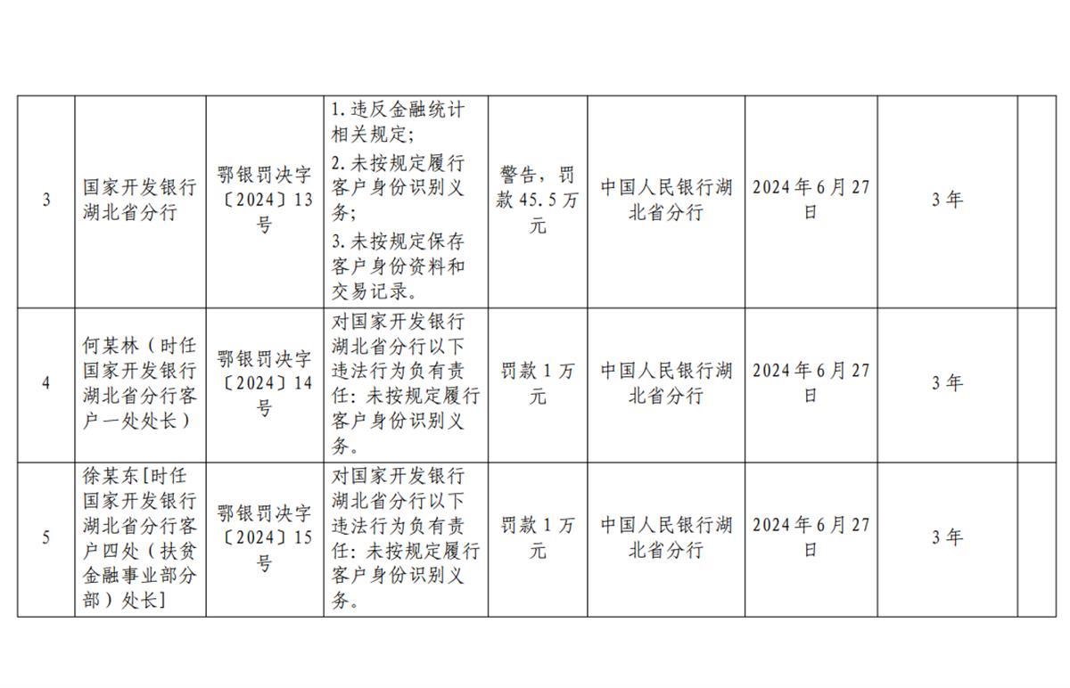 7月5日,中国人民银行湖北省分行行政处罚决定信息公示表显示,因存在三项违法行为,国家开发银行湖北省分行被罚45.5万元,三位责任人也受到处罚。