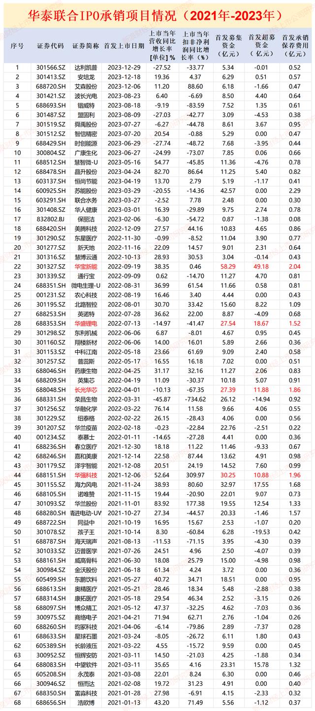2021-2023年,华泰联合2023年合计保荐成功上市的68家IPO项目中,有33家上市当年营收或扣非净利润同比下降,占比48.53%,接近五成。