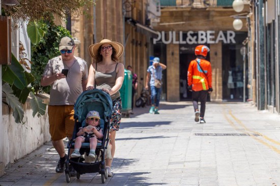 6月4日,人们戴着帽子走在塞浦路斯首都尼科西亚街头。新华社发(乔治·克里斯托弗鲁摄)
