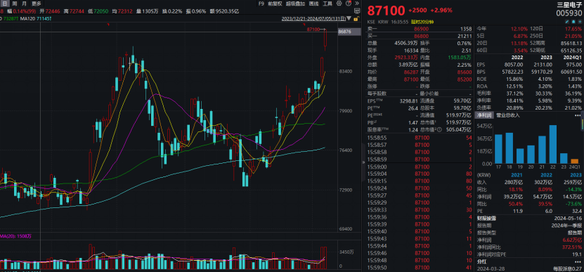 当天,在财报的刺激下,三星电子股价涨近3%,刷新近三年新高,市值也攀升至519.97万亿韩元,折合人民币约2.76万亿元。这也推动韩国综合指数涨超1%,刷新2022年1月以来新高。