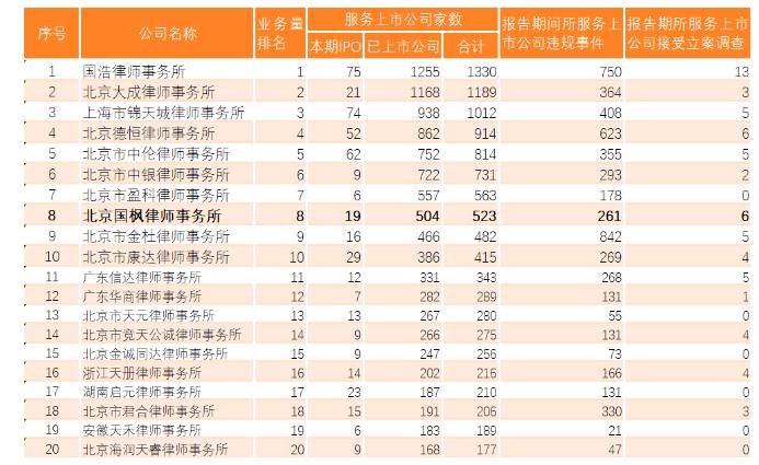 Wind数据显示,2023年,国枫律所承揽19个IPO项目,服务504家已上市公司,总业务量排名国内第8名。截至今年6月21日,共计1116家律师事务所在证监会完成从事证券法律业务律师事务所首次备案。