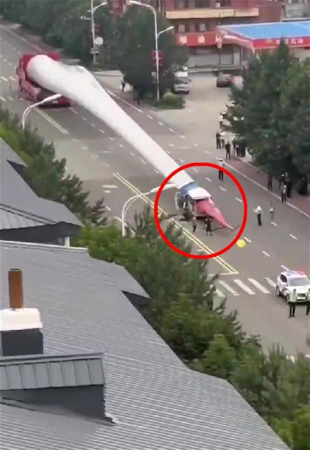 现场视频显示,一辆运输风力发电机叶片的货车停在路上,一辆面包车被叶片刺穿,面包车内有人被困,民警和救援人员已到场处置。