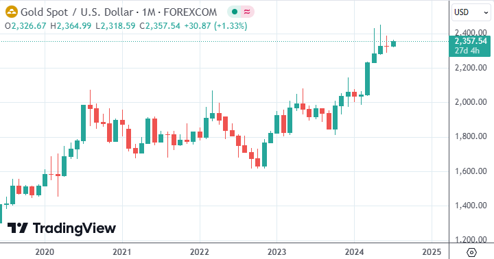 在周三涨超1%之后,现货黄金价格重新回到每盎司2360美元附近,年初至今的涨幅也达到了14%。