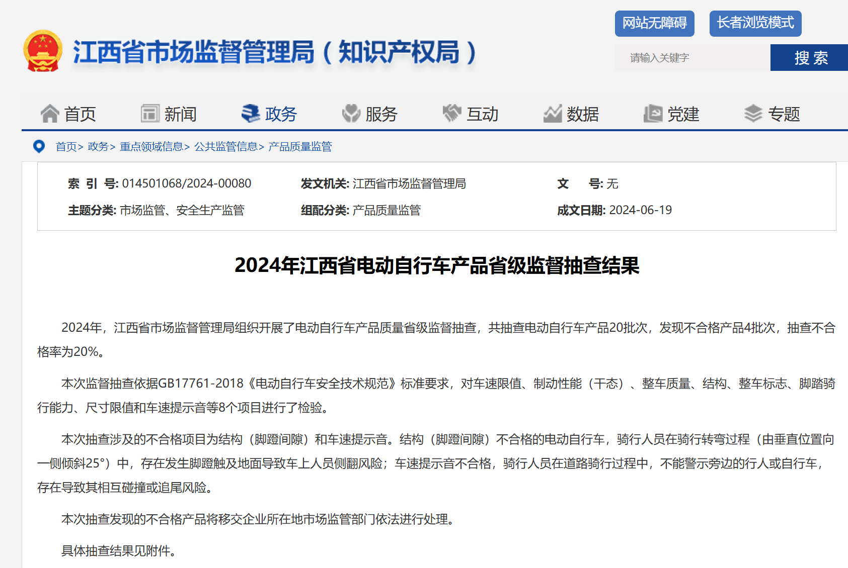 近日,江西省市场监督管理局组织开展了电动自行车产品质量省级监督抽查,共抽查电动自行车产品20批次,发现不合格产品4批次,抽查不合格率为20%。