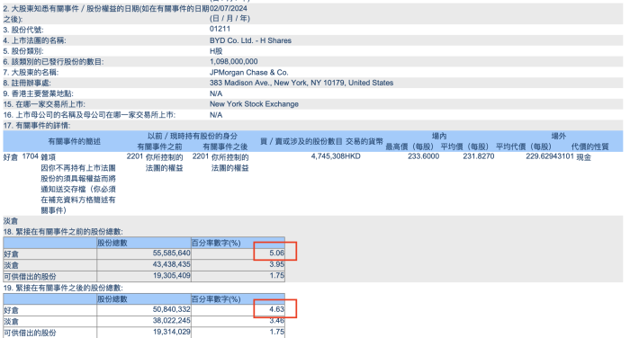 港交所文件显示,摩根大通对比亚迪股份H股的多头持仓比例由5.06%降至4.63%。
