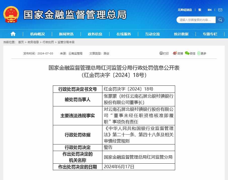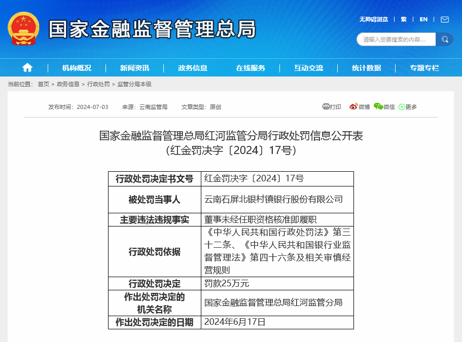 7月3日,国家金融监管总局官网披露,云南石屏北银村镇银行股份有限公司因为董事未经任职资格核准即履职,被罚款25万。因同样事由,该银行时任董事长被警告。