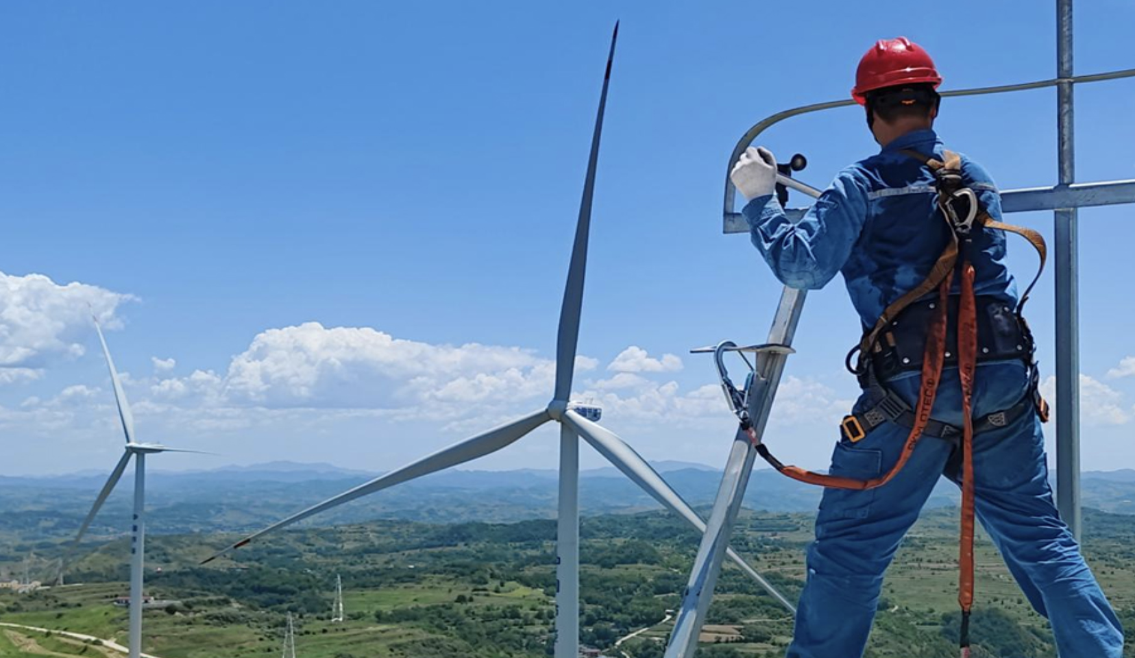 针对夏季高温环境下风机的特定问题,中国节能各风电场对风机主齿箱散热系统等易高温部位进行专项清理维护并及时采取降温措施。图为中国节能所属风电甘肃区域公司天水风场检修员更换风机上的风速风向仪。