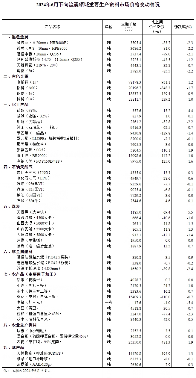 据对全国流通领域9大类50种重要生产资料市场价格的监测显示,2024年6月下旬与6月中旬相比,12种产品价格上涨,33种下降,5种持平。