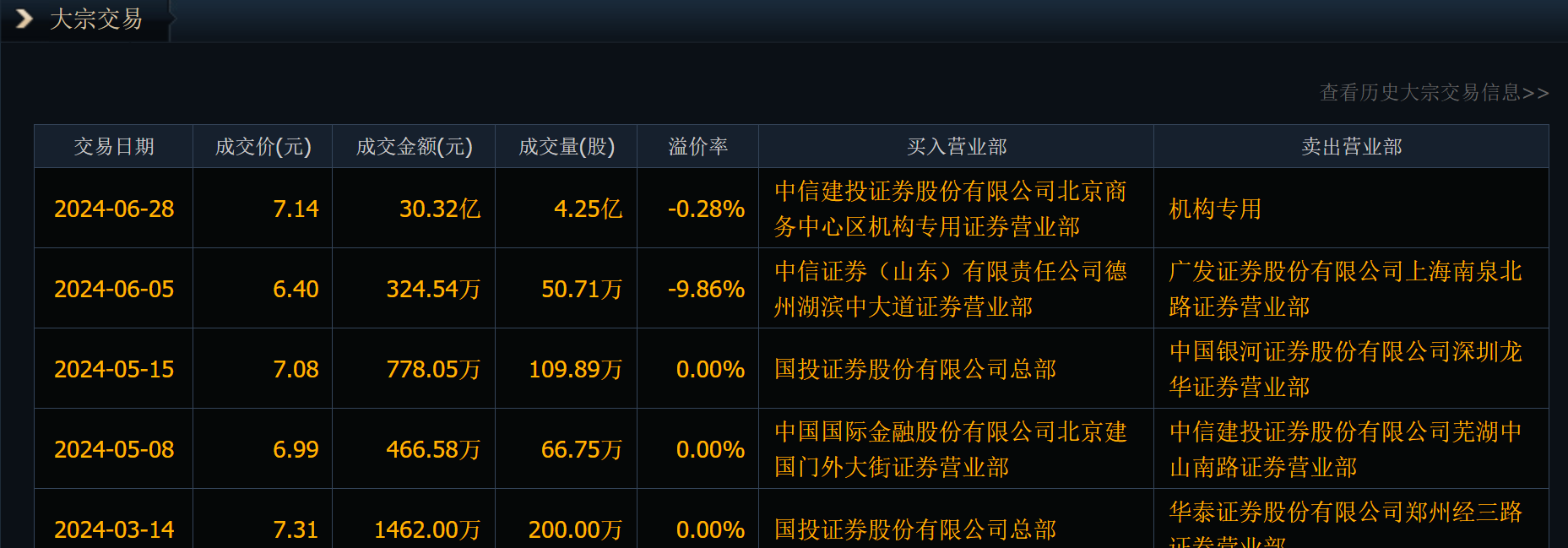 6月28日,大秦铁路大宗交易平台出现一笔成交,成交量4.25亿股,成交金额30.32亿元。这笔交易成交均价为7.14元,相对当日收盘价(7.16元/股)折价0.28%。股份数量与中信资管持有一致,席位也是机构,可能是其卖出。