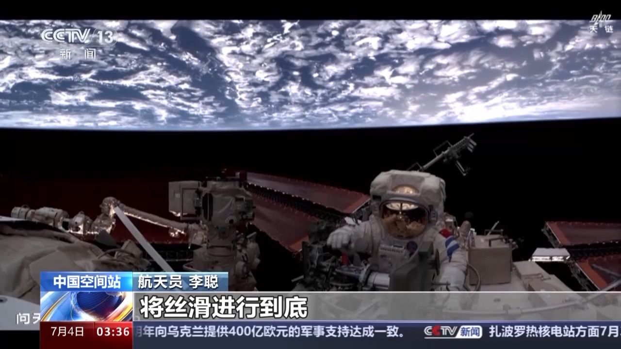 航天员 李聪:中国空间站非常美,非常漂亮。每当机械臂运动到制高点的时候,虽然阳光很刺眼,但是都会忍不住地想多看两眼,真的由衷感受到了这项工程的伟大。为所有航天人点赞,为我们伟大的祖国点赞。我们必将再接再厉,顺利圆满高效地完成后续任务,将“丝滑”进行到底,我们舱内摄像机见。