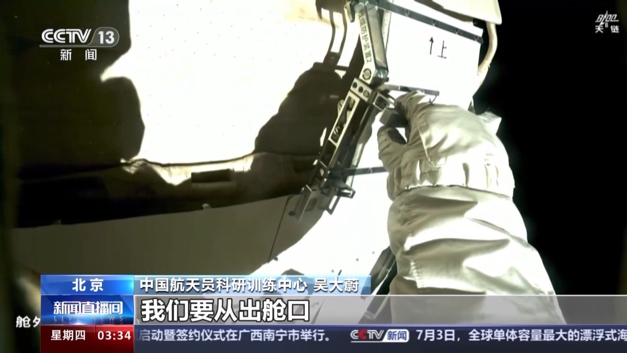 16时19分,航天员李聪打开问天实验舱出舱舱门,开始个人首次太空行走。