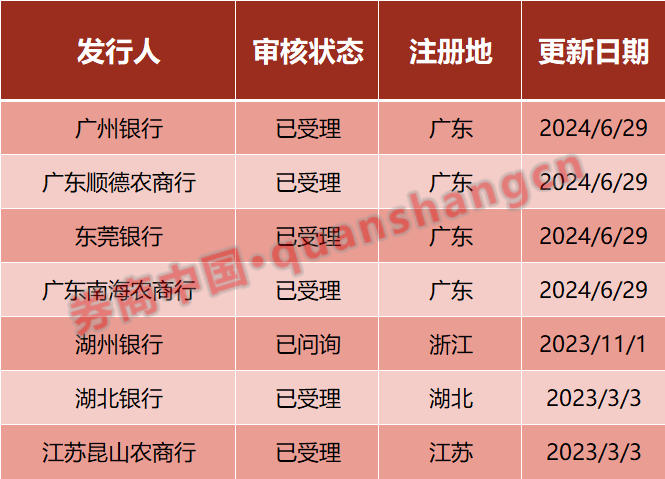 此外,6月29日,广州银行、广东顺德农商行、东莞银行、广东南海农商行更新了审核状态,从此前的“中止”更新为“已受理”。