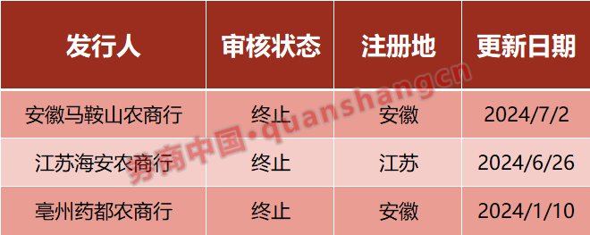 7月2日晚间,深交所发布公告表示,因安徽马鞍山农商行及其保荐人撤回发行上市申请,根据相关规定,深交所决定终止其发行上市审核。当前,该行的上市审核状态已为“终止(撤回)”。