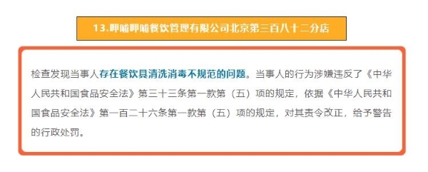 其中,呷哺呷哺餐饮管理有限公司北京第三百八十二分店被发现存在餐饮具清洗消毒不规范的问题。其行为涉嫌违反了《中华人民共和国食品安全法》第三十三条第一款第(五)项的规定,朝阳市场监管局依据《中华人民共和国食品安全法》第一百二十六条第一款第(五)项的规定,对其责令改正,给予警告的行政处罚。