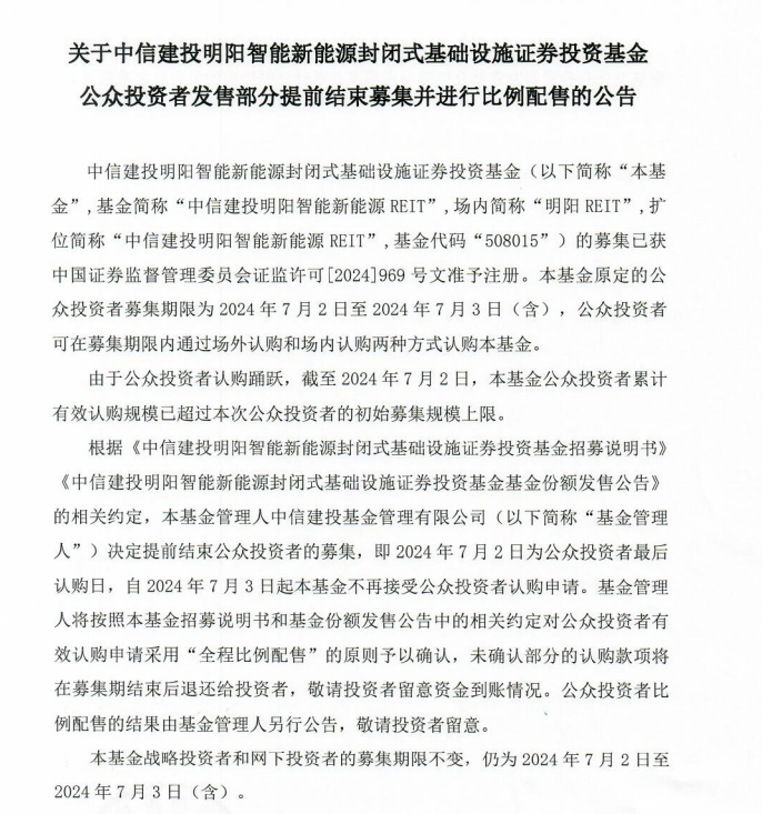 公告显示,中信建投明阳智能新能源REIT原定公众投资者募集期限为2024年7月2日至2024年7月3日(含)。由于公众投资者认购踊跃,截至7月2日,该基金公众投资者累计有效认购规模已超过公众投资者的初始募集规模上限。