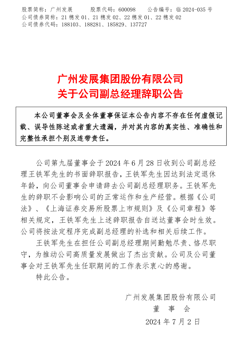 7月2日,广州发展发布公告称,公司第九届董事会于6月28日收到公司副总经理王铁军先生的书面辞职报告,王铁军先生因达到法定退休年龄,向公司董事会申请辞去公司副总经理职务。王铁军先生的辞职不会影响公司的正常运作和生产经营。