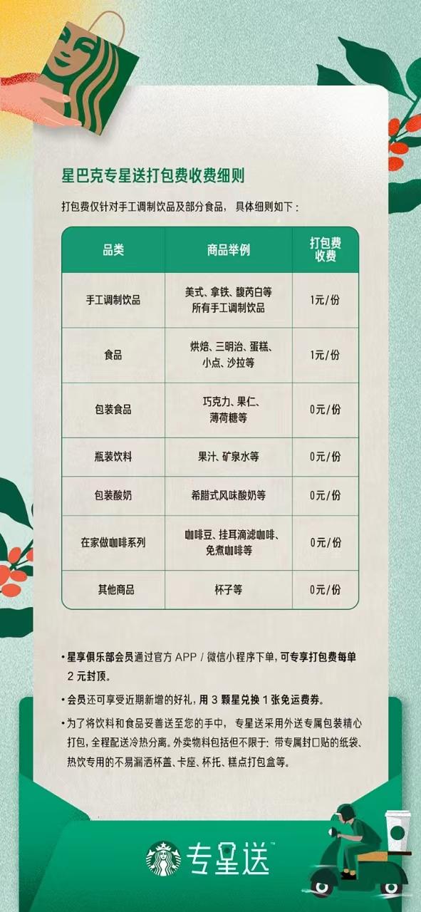 记者7月3日了解到,星巴克专星送的服务收费方式将进行整合调整。专星送配送费从每单9元下调至7元,同时部分商品开始收取每件1元的打包费。