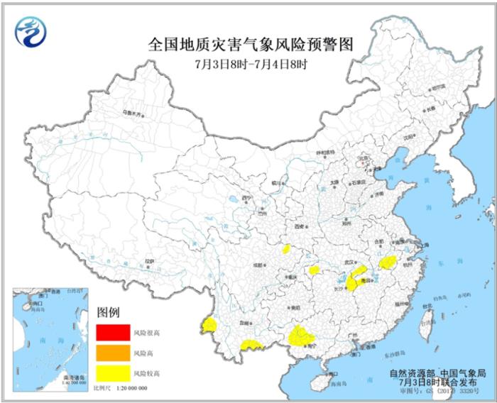 中新网7月3日电 据中央气象台网站消息,自然资源部与中国气象局7月3日8时联合发布地质灾害气象风险预警。预计,7月3日8时至4日8时,安徽南部、江西北部、湖北南部、湖南东北部、广西中北部、四川东北部、云南西部和南部发生地质灾害的风险较高(黄色预警)。请当地居民注意防范降水引发的地质灾害,尤其是地质灾害隐患点附近区域。