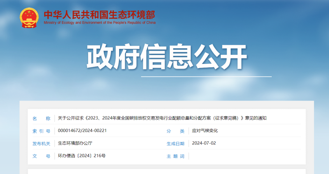 关于公开征求《2023、2024年度全国碳排放权交易发电行业配额总量和分配方案(征求意见稿)》意见的通知