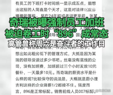 “要求员工1周无偿加班20小时以上”“有应届生员工工作近300小时到手薪资4800元”... ...近日,“员工投诉奇瑞强制加班”话题引发热议。