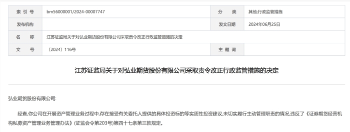 7月1日,江苏证监局对弘业期货(001236.SZ)采取责令改正行政监管措施。