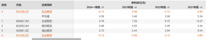 虽为业内唯一一家两地上市的期货公司,但与其余三家A股期货公司相比,弘业期货在经营层面却长期垫底。Wind显示,2024年一季度,弘业期货净亏损1326.70万元,同比下降327.56%,也是四家A股上市期货公司中唯一净亏损机构。