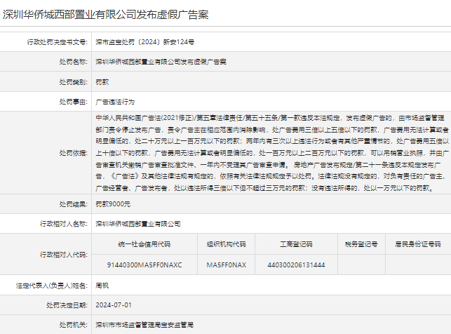 深圳市场监督管理局日前发布的消息显示,深圳华侨城西部置业有限公司发布虚假广告被处罚9000元,处罚机关是深圳市市场监督管理局宝安监管局。