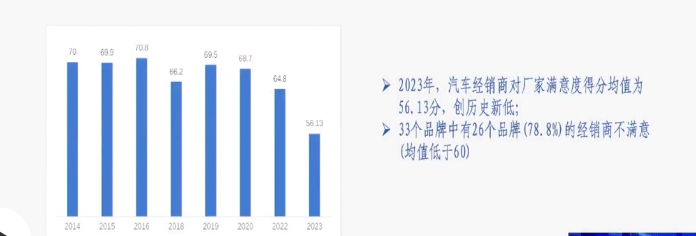 惨淡的经营状况,让经销商对汽车品牌的满意度大打折扣。《报告》指出,2023年汽车经销商对厂家满意度得分均值创历史新低,仅有56.13分,2022年这一数字为64.8分;调研的33个品牌中有26个品牌的经销商表示不满意,占比高达78.8%。